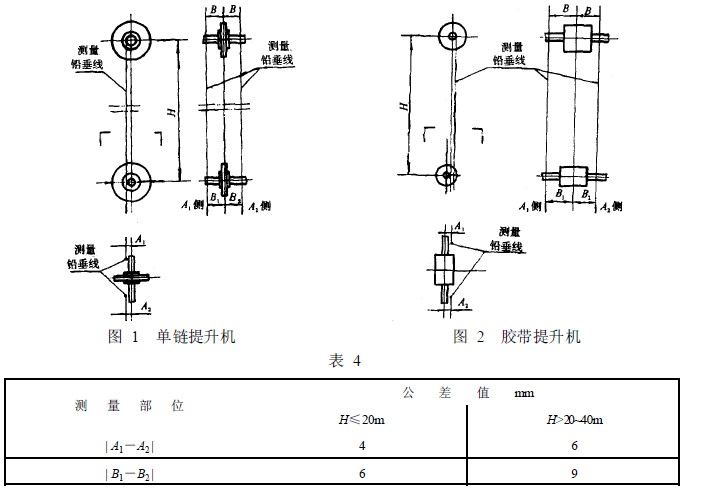 距離);上,下鏈輪(滾筒)組裝配后,用手轉動應輕便靈活.拉緊裝置調整應靈活,在牽引件安裝和調整好后,未被利用的行程應不小于全行程的50%.提升機牽引膠帶接頭處徑向承載能力應不低于膠帶徑向扯斷強度.
